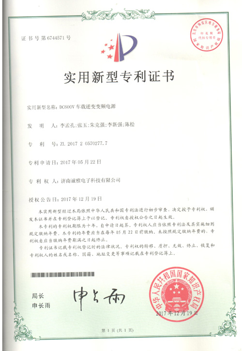 济南诚雅电子科技有限公司自主研发生产的DC600V车载逆变电源荣获国家实用新型专利证书